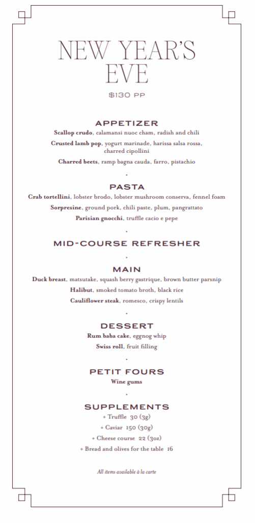Welcome 2026 at Peacock with a refined four-course prix fixe dinner for one hundred and twenty dollars per guest. Enjoy elegant, winter-inspired dishes crafted to make the evening memorable.